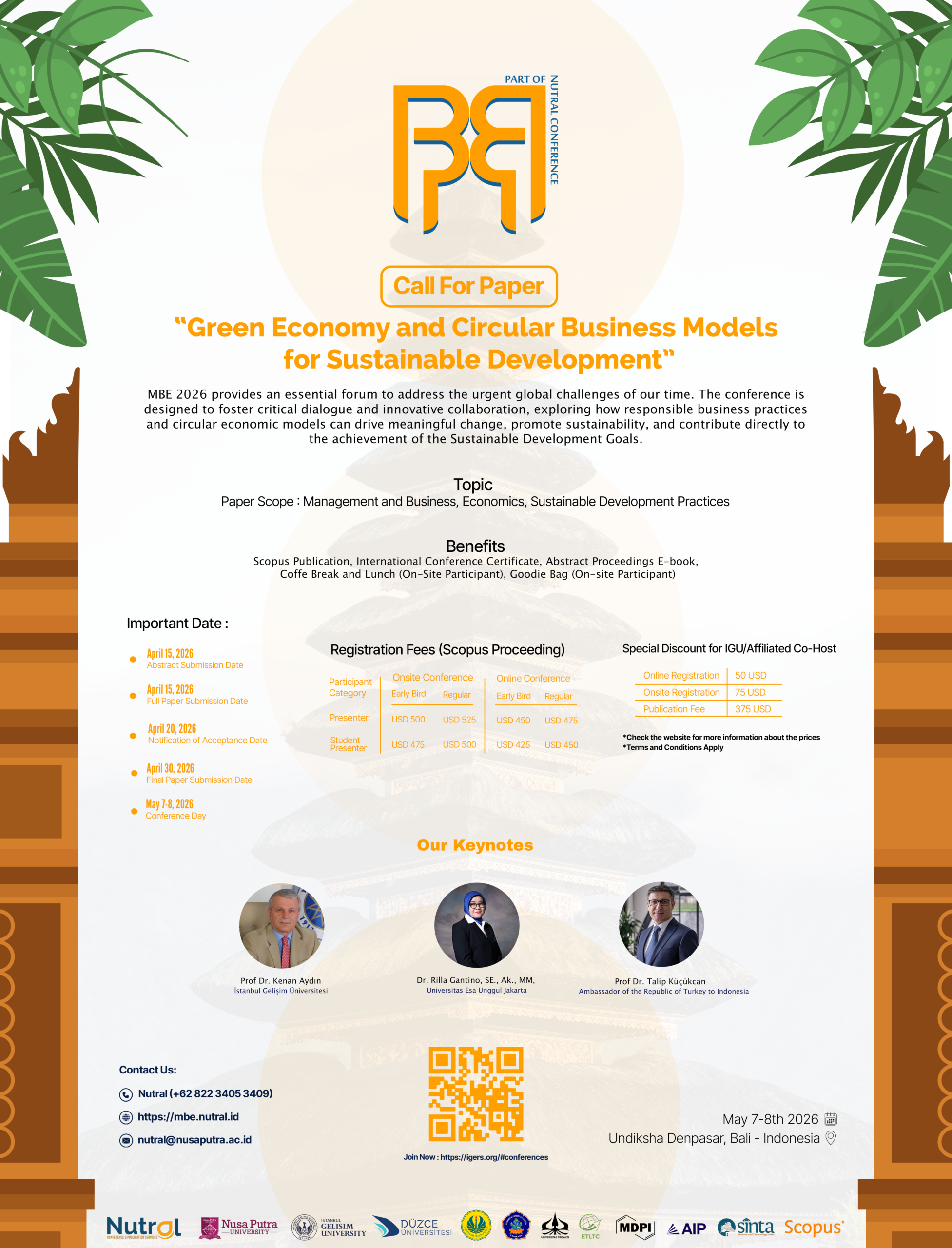 We warmly invite you to contribute actively by submitting your abstracts and full papers, presenting your research, and engaging in thought-provoking discussions. MBE 2026 will bring together scholars, practitioners, and innovators on-site in Bali while also welcoming virtual participation, ensuring a globally connected and inclusive academic experience. All accepted papers will undergo rigorous peer review and, upon meeting quality requirements, will be submitted for publication in Scopus-indexed proceedings.